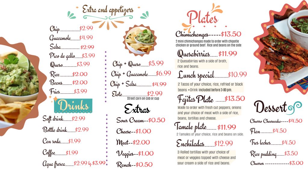 our favorites include the tres leches cake, tamales, street tacos, and quesabirria. Our burrito bowls have been especially popular!