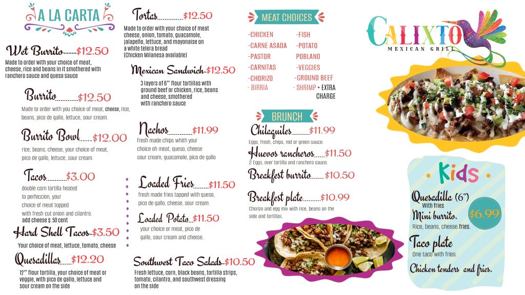 enjoy Calixto’s casual setting and affordable authentic Mexican menu. Some of